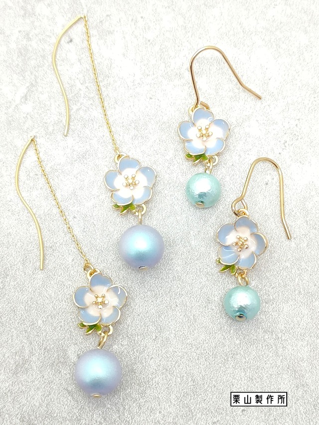 ピアス・イヤリング KC/淡いブルーのネモフィラ!清涼感と気品で耳元で爽やかに可憐を演出!ショートとロング2種ご用意!