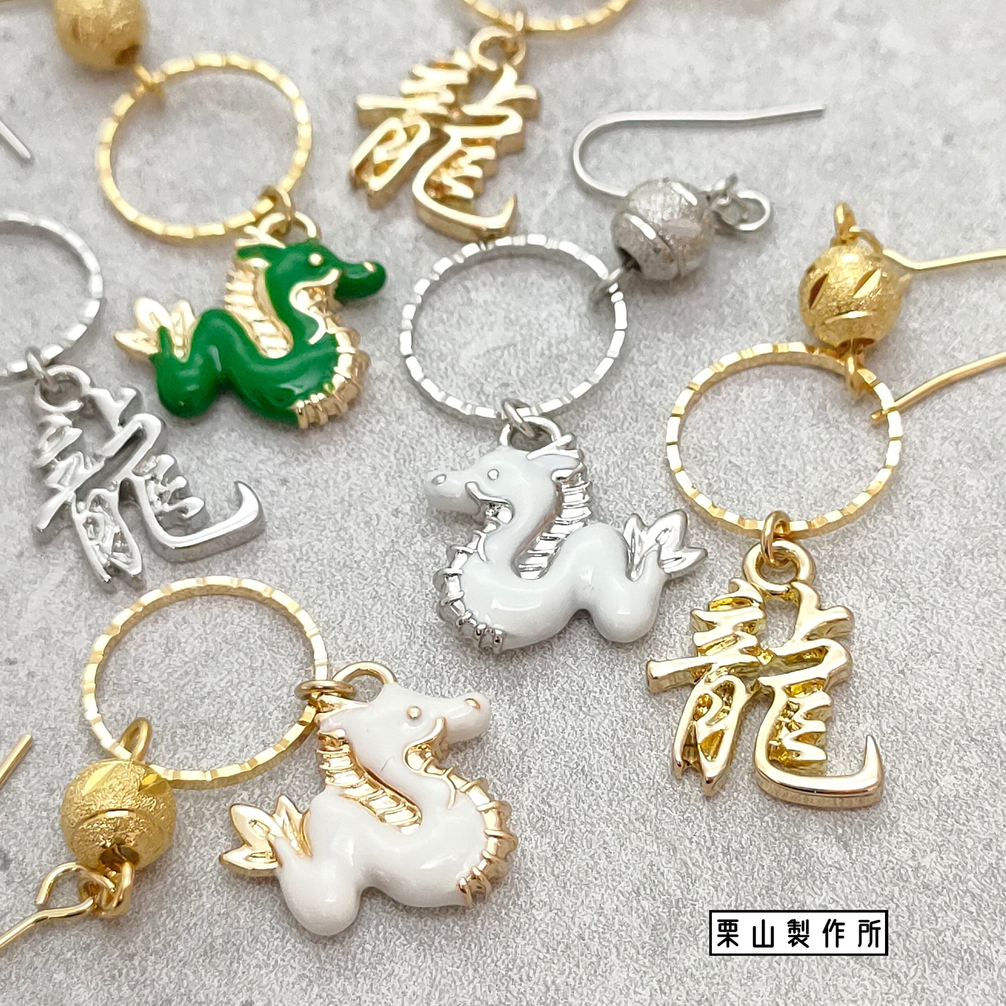 ピアス・イヤリング ZC/白龍・緑龍に漢字龍のチャームにスターダストビーズを合わせたポップな和風モダン!歌舞伎者に!